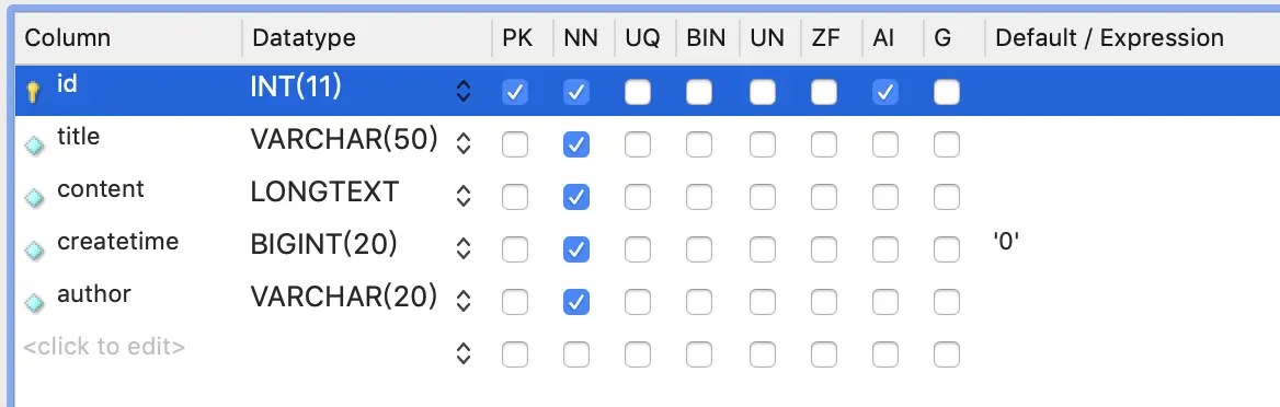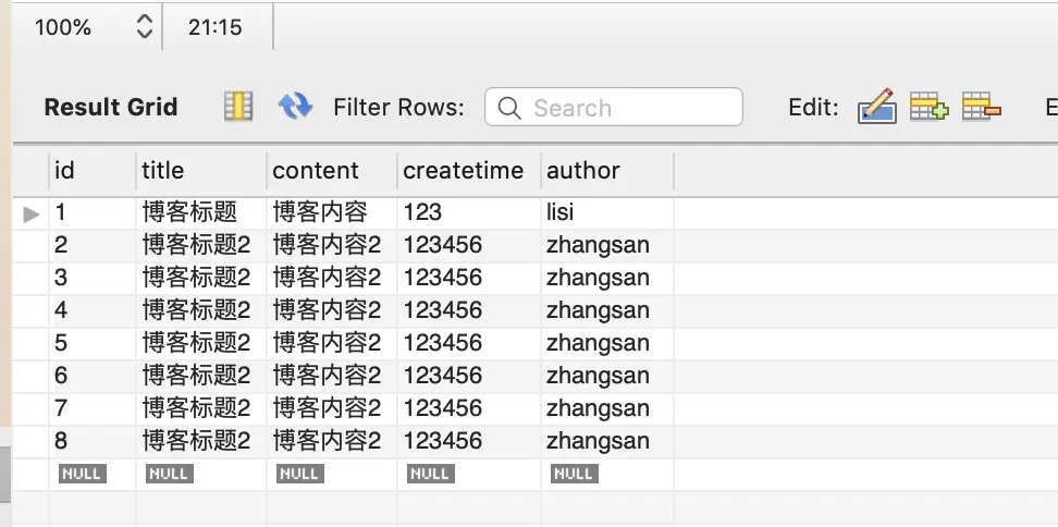 select * from blogs; 就是博客列表中需要获取数据库数据的sql语句,当然后面如果有筛选搜索等功能,这个sql语句会相应修改,目前是一个最简单的语句用于测试我们的数据库是否已经连接成功。