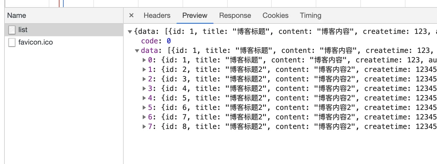 现在我们可以试一下,运行我们的服务端代码,npm run server, 在浏览器输入: http://localhost:3000/api/blog/list, 看下数据库中的数据是否返回: