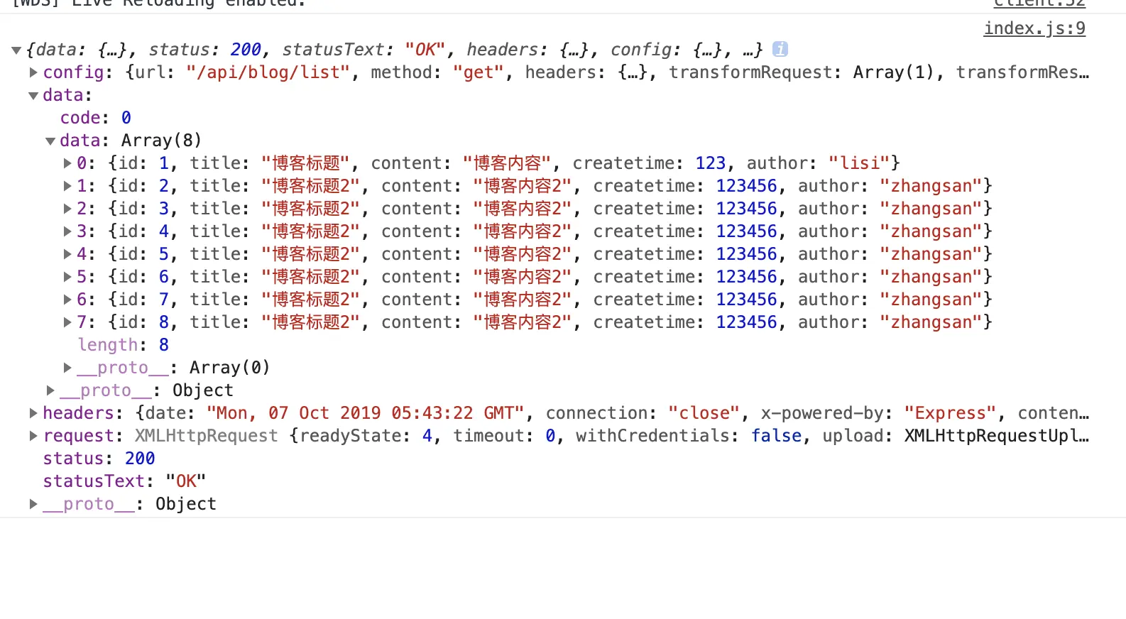 然后我们在/pages/blog/index.js中写一个简单的请求方法即可: