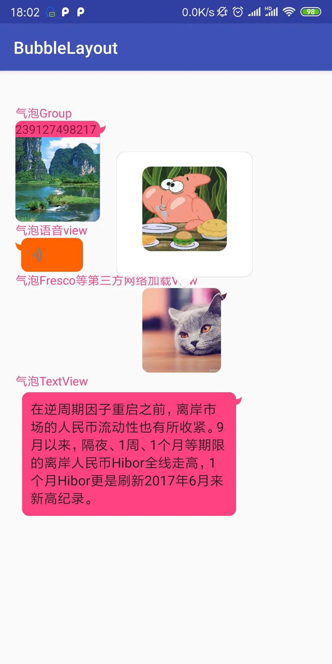 在即时通讯类应用里,很常见各种气泡布局包裹消息,通常我们采用.9图实现。但是使用气泡图片面临着间距不可控,如果是图片消息,此方法就无法实现气泡。本文将介绍如何更加用优雅的方式去实现自定义气泡布局。