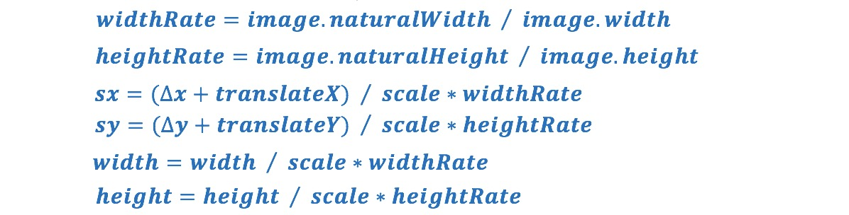 解决方法:裁剪操作的图片大小并不是在屏幕上显示的图片大小,而是源图片的大小。需要使用element.naturalWidth和element.naturalHeight属性来正确计算裁剪和缩放区域等内容,而不是element.width和element.height。