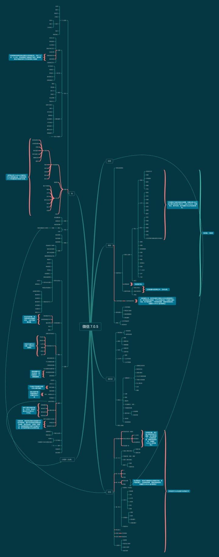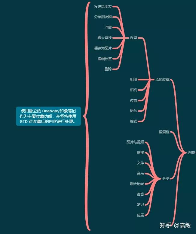 所以我做了这么一张示意图,把它所涵盖的工具功能几乎全部罗列了出来。其中绿色部分是所有的功能,红色是我认为可以根据自己的行为习惯进行改造的部分。上图由 XMind ZEN 制作,你可以在 Topbook 后台回复 “微信改造”,直接下载高清的 png 图片。
