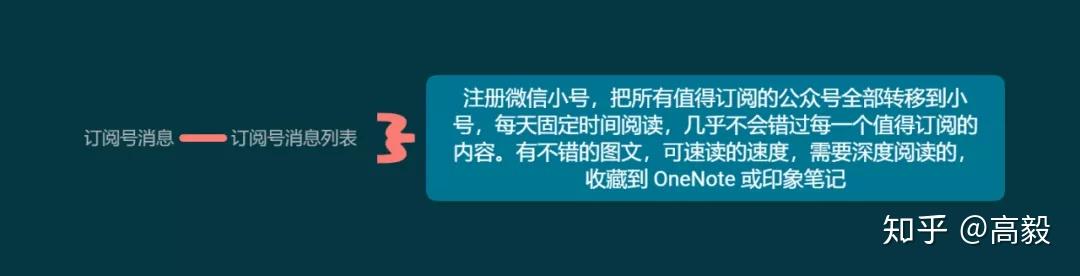 注册一个微信小号,把所有的订阅号全部转移到小号当中,每天固定时间切号阅读。这样一来,我不会错过任何一个我关注的订阅号。另外,我会为自己的阅读时间设限。比如三十分钟就得看完当天的所有推送,那么一些没必要深度阅读的文章就速读,需要深度阅读的文章而时间不太够怎么办呢?发送到你的印象笔记或者 OneNote ,专门抽时间阅读整理。