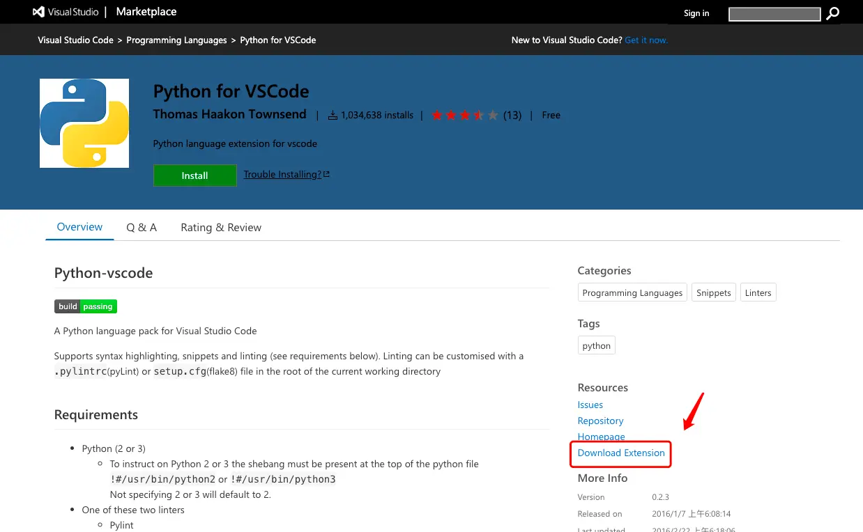 在早一些的版本中,是无法在编辑器中直接安装插件的。**最新的版本好了一些,大部分插件都能直接搜索并且安装。**但是还是有少部分无法安装成功。这里提供一种离线安装的思路: 到网页版商店下载离线包,VSCode 扩展商店网页版:marketplace.visualstudio.com/vscode 搜索扩展,进入到详情页之后,选择右下角的 Download Extension 下载离线包。