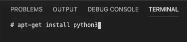 然后在这个 docker 容器中安装 python3,打开 vscode debug 按钮下的命令行,输入如下命令: