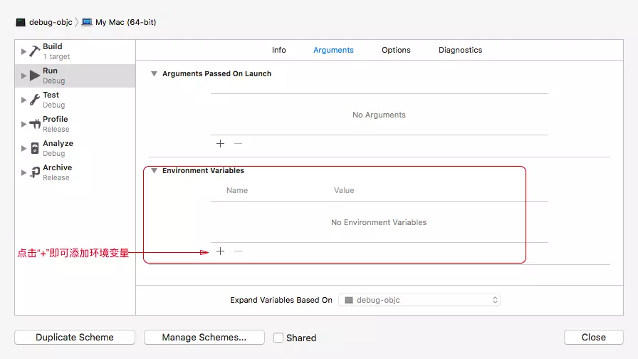 这几个函数笔者就不多做介绍了,这里告诉大家如何在Xcode中设置参数,使得_NSGetEnviron能读取到。
