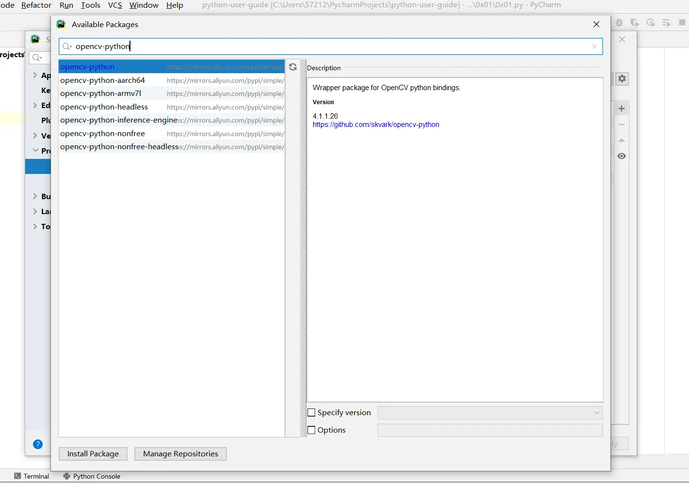 搜索opencv-python和opencv-contrib-python安装OpenCV库及其扩展: