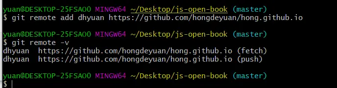 再接着,连接远程仓库,使用:git remote add dhyuan https://github.com/hongdeyuan/hong.github.io ;并使用:git remote -v :查看远程连接的地址 如下图所示: