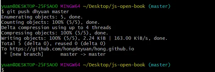 最后,将本地仓库代码推送到远程库:使用 git push dhyuan master,如图所示: