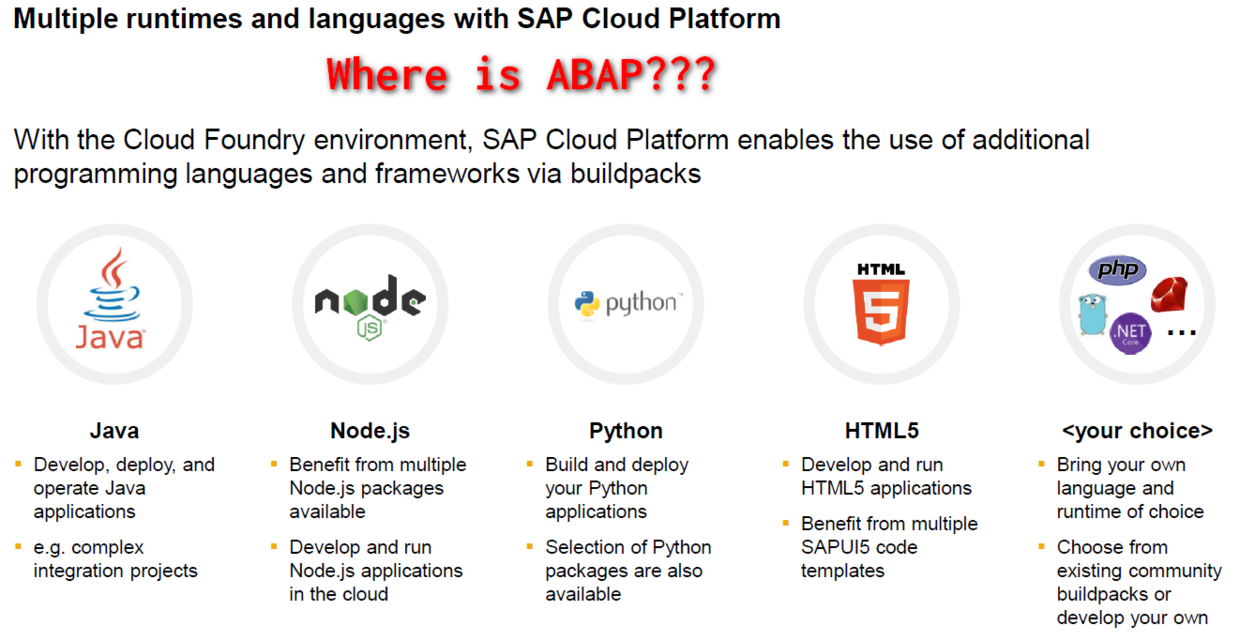 SAP Cloud Platform发布后很长一段时间,在SAP各大技术社区里,能感觉到ABAP从业者们内心一丝隐隐的失落:尽管SAP和其他IT公司一道,大步迈开了向云端转型的步伐,在SAP云平台上通过BYOL(Bring Your Own Language)的架构,实现了对业界流行编程语言的支持,这使得拥有Java,nodejs,PHP,Python,Ruby,Go等编程技能的开发人员们,也能加入SAP生态圈这个大家庭。