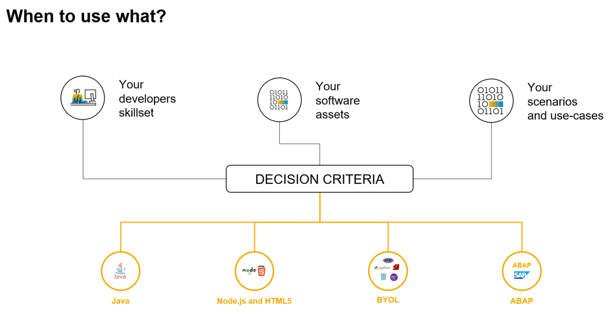 如今SAP Cloud Platform上可供选择的编程语言又增添了ABAP,那么我们接到开发任务时,根据什么样的依据从工具库里挑选使用的编程语言呢?