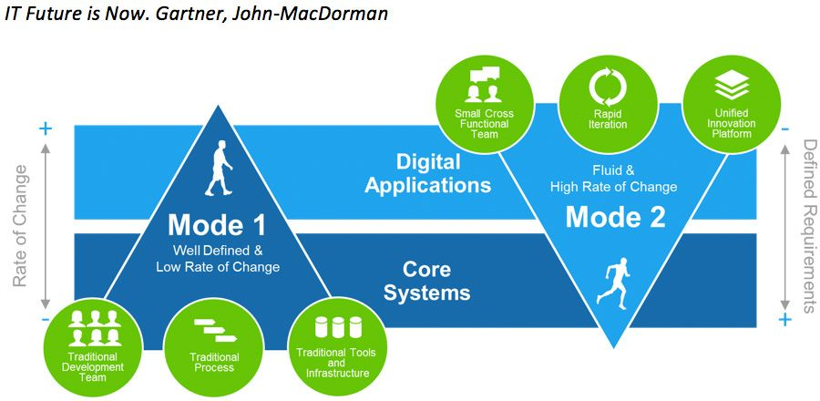 这种增强方式非常符合咨询公司Gartner的大佬,John MacDorman提出的IT双模型的交付模式,即采取两套独立管理却彼此互补的模式,一套交付模式采用传统成熟的软件开发方式,需求变动频率相对较低,强调交付的健壮和稳定性。另一套则兼走偏锋,遵循“天下武功,唯快不破”的理想,强调敏捷,创新,探索,速度,高频次的迭代。