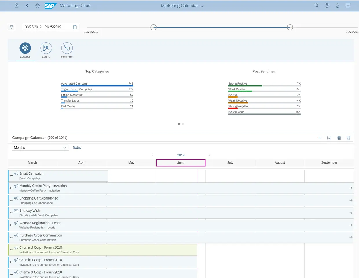 日历上方区域显示营销活动三大KPI:Success, Spend, Sentiment;