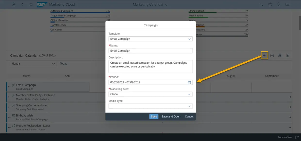 在日历视图中可以通过点击加号创建营销活动,可以基于标准或自定义的营销活动模板进行创建。保存营销活动时,如果其符合过滤条件,则该营销活动就会显示在日历和列表视图中。