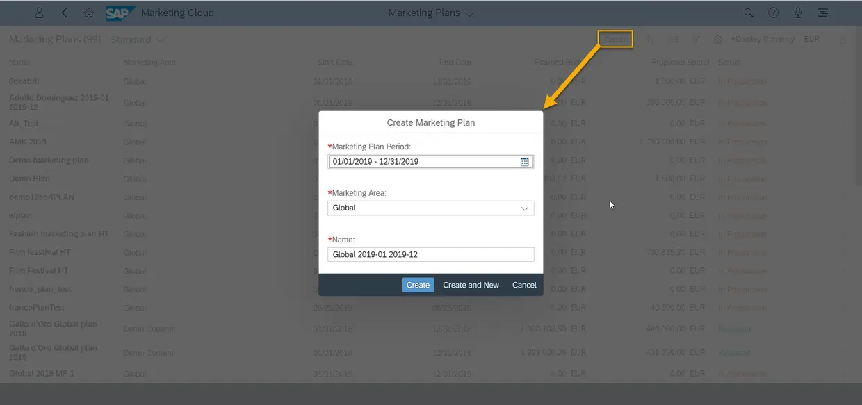 创建市场营销计划: Marketing Plan应用概览页展示了当前的计划列表,点击可以查看计划详情。点击Create可以创建新的Plan.