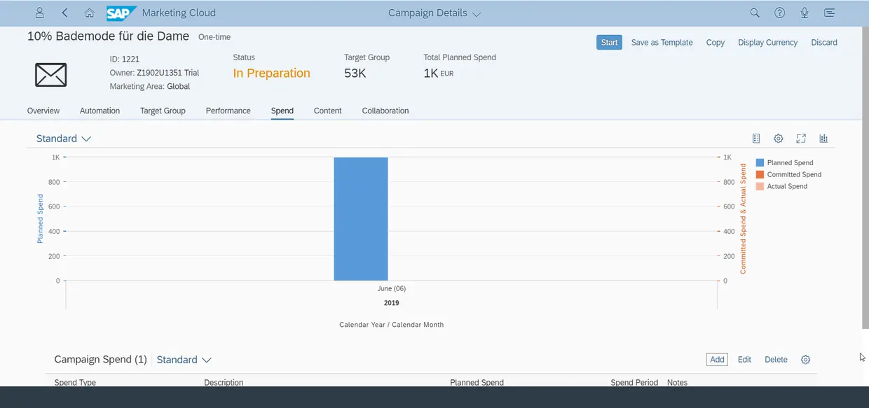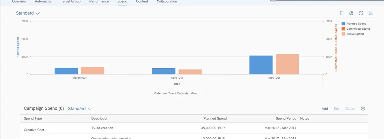 在Campaigns应用详情页的Spend模块,我们可以查看实际支出、承诺支出和计划支出。可以在此直接添加计划支出数据。