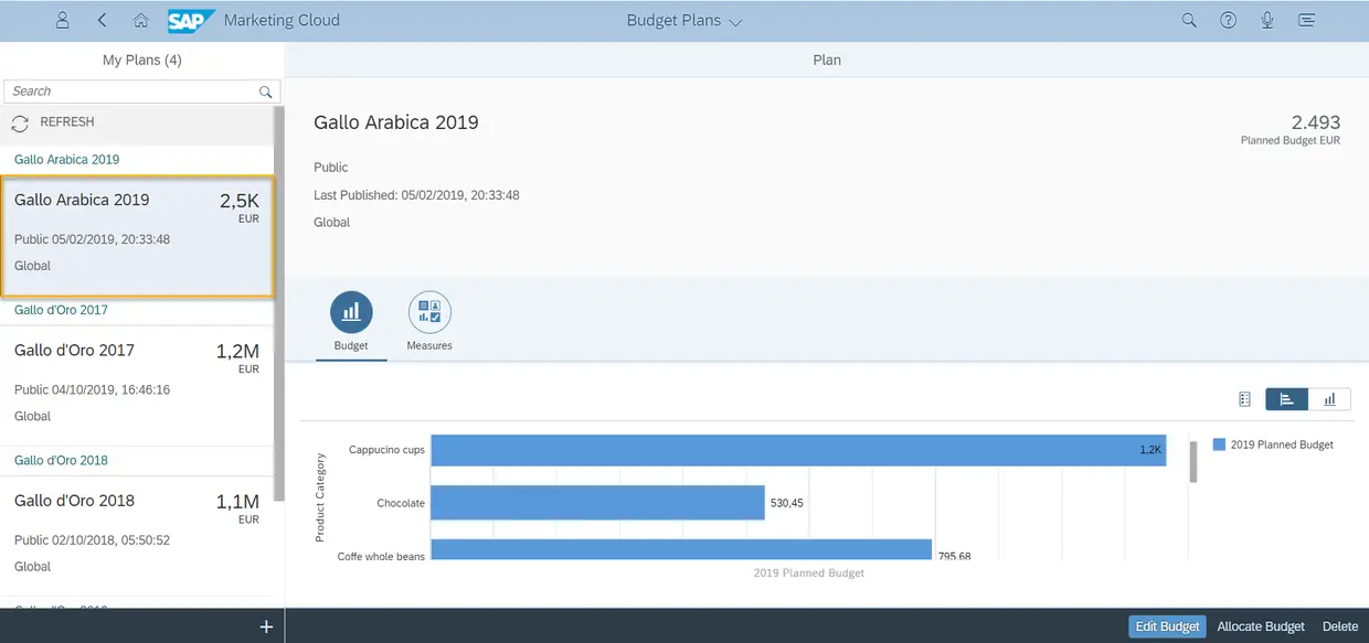 在Budget Plans应用中,我们可以在左侧列表选择Plan查看budget分配详情。