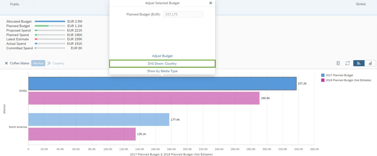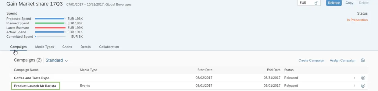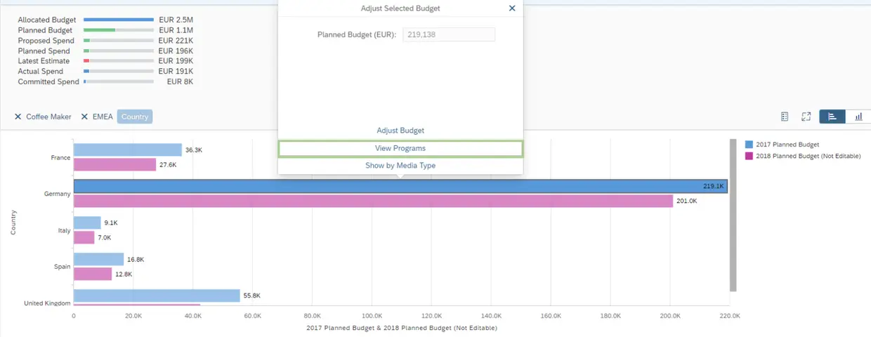 计划预算:市场营销经理在Budget Plans应用中计划市场营销活动的预算, 可以多于分配的预算。