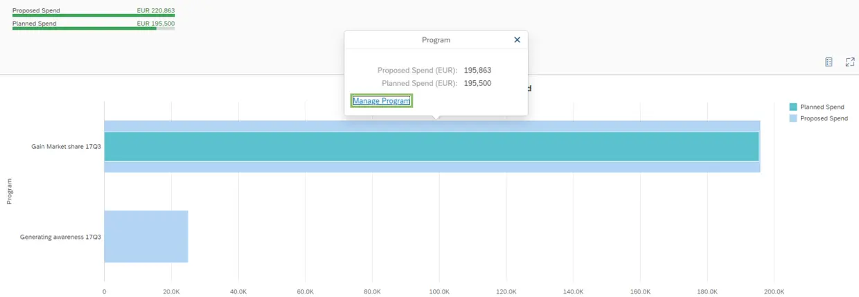建议支出:市场营销经理和专家在Campaigns应用中按方案的媒体类型给出的建议支出, 可以多于预算。