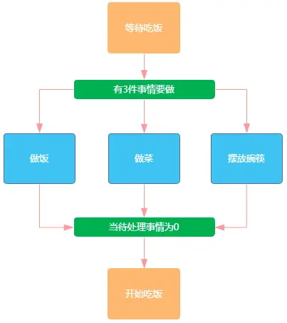 现实生活做中有很多这样的场景:做F前需要等待A,B,C,D,E完成,A,B,C,D,E可以并发完成,没有特定顺序,例如:周末在家里吃饭,有3件事情要做,爸爸做饭,妈妈做菜,儿子收拾餐桌,摆放碗筷。可以看到这个场景的特征为: