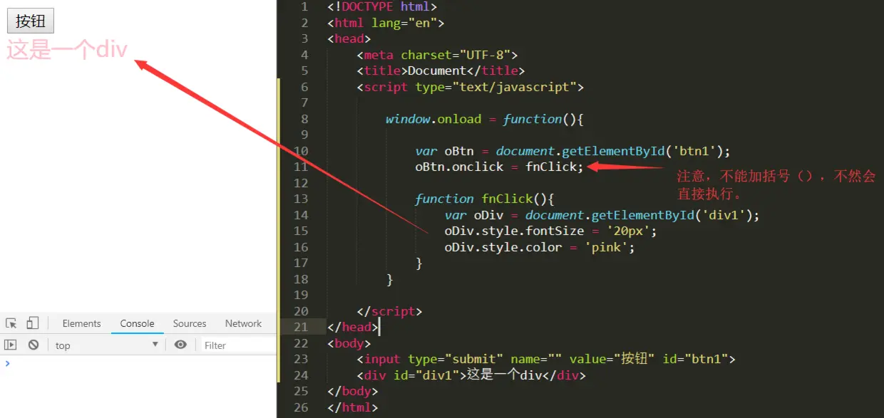 另一个要注意的是,在JavaScript中oBtn.onclick = fnClick;的fnClick不能写成fnClick()。