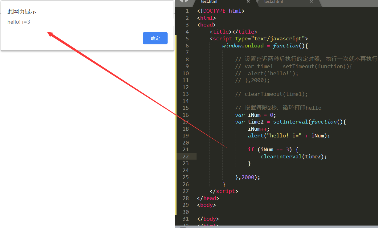 每个2秒,循环打印hello 。当打印3次,就终止。