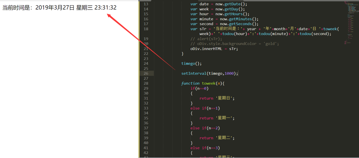 var sTr = '当前时间是:'+ year + '年'+month+'月'+date+'日 '+toweek(week)+' '+todou(hour)+':'+todou(minute)+':'+todou(second);