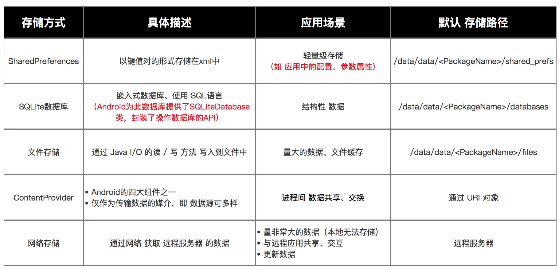 除了SharedPreferences,Android常见的数据存储方式主要包括: