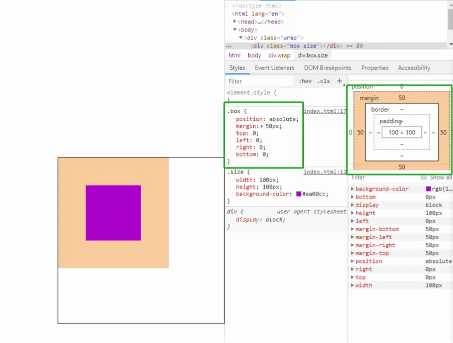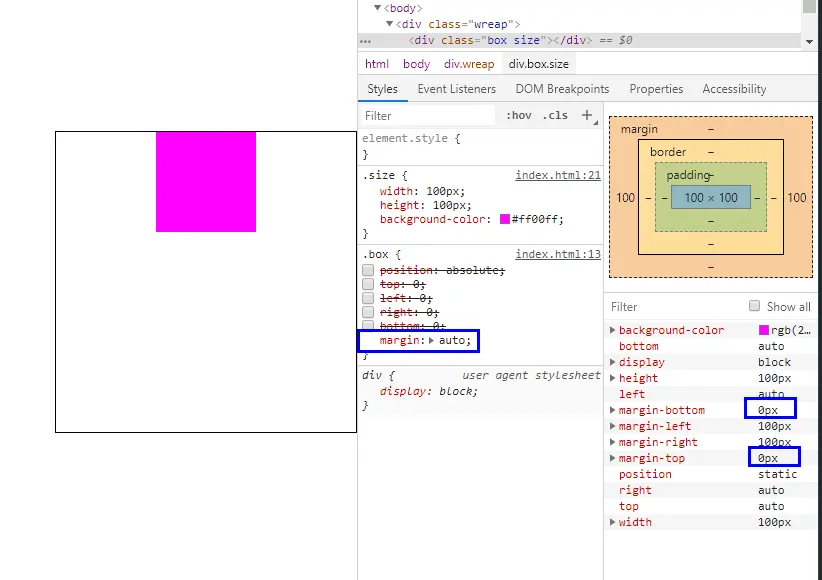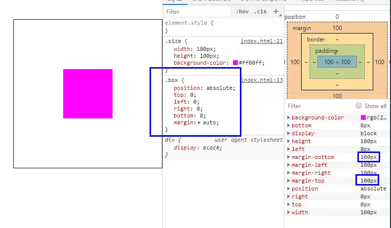 当然既然讨论到了这里,喜欢搞事的小伙伴自然会想到,那如果我即设置了距离top,right,bottom,left为0,有设置maigin为一个定值且小于到达父元素内边的值会如何呢?