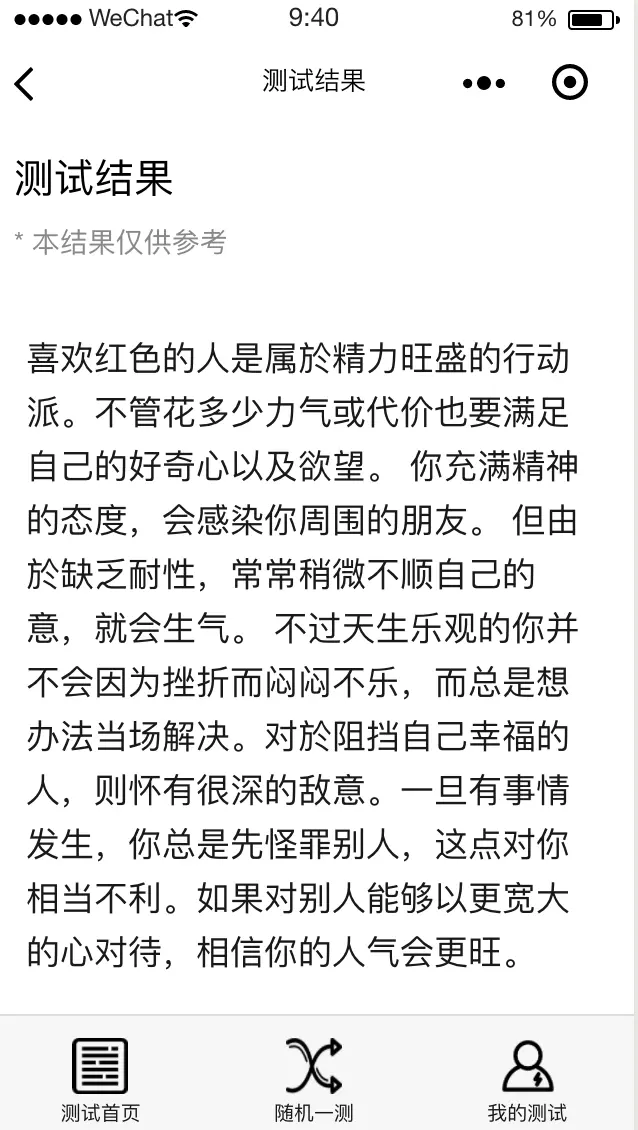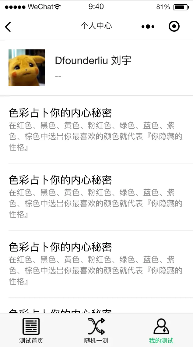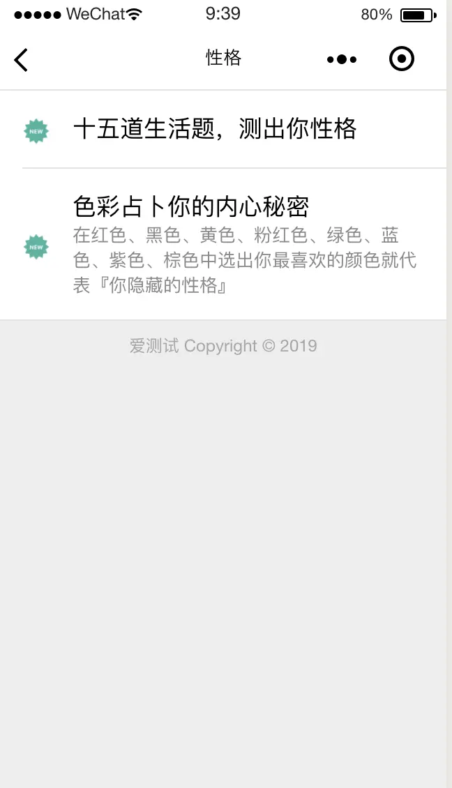 十一在家期间,我看了九型人格这本书,觉得很不错,想要做一下测试,测试的时候就是去网上搜了一下相关的测试,就开始了。但是转念一想,能不能做一个专门测试的小程序,里面可以增加各种各样的测试题目?于是,“国庆没去旅游的我”就开始了基于SCF的测试小程序的编写。