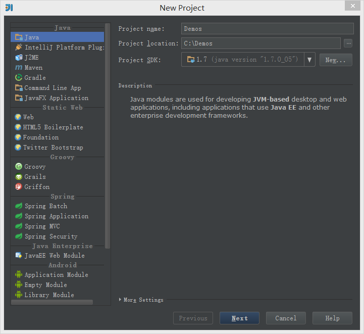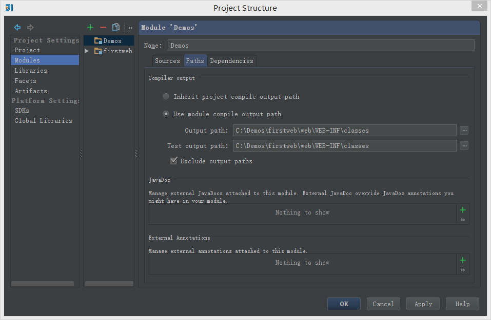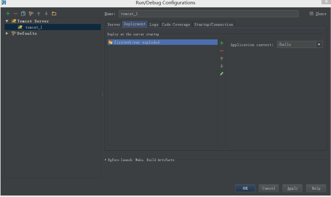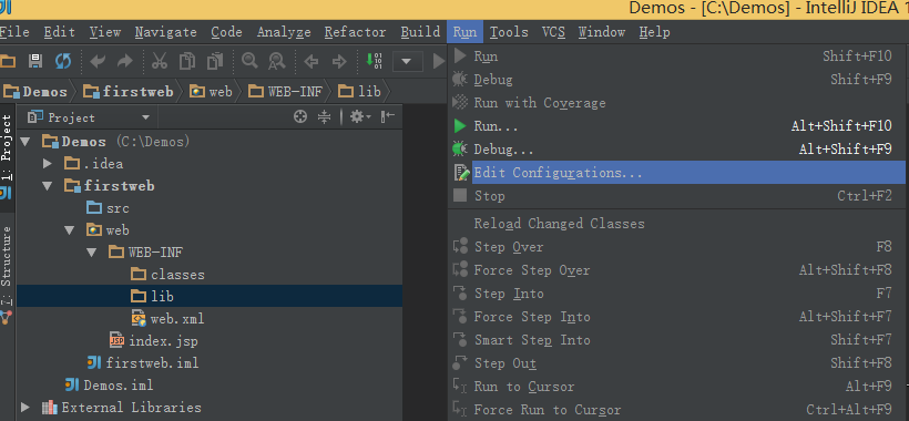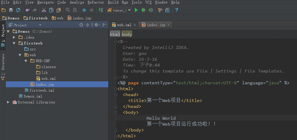 Intellij Idea的安装非常简单,一步一步安装即可。 JDK的安装也挺简单的,重要的是配置环境。在环境变量Path里面添上Java的安装路径即可。 Tomcat文件夹不用安装,直接解压放在C盘下即可,或者放在其他文件夹下也可以,但是文件夹的名字最好不要带中文~~~不信?那你试试~~ Idea创建Web项目步骤: 1、创建一个项目 File -> New Project -> 输入项目名称“Demos” ,选择Project SDK为1.7 -> Next -> Finish ![]() 2、创建一个Module 鼠标点中项目名称demos -> 右键选择New,选择Module 输入Module名称“firstweb” -> 点击Next 勾选“Web Application” -> 确认已勾选“Create web.xml” -> Finish 3、创建好的web项目 classes用来存放编译后输出的class文件,lib用于存放第三方jar包。 5、配置文件夹路径 File -> Project Structure (快捷键:Ctrl + Shift + Alt + S) -> 选择Module : 选择 Paths -> 选择"Use module compile output path" -> 将Output path和Test output path都选择刚刚创建的classes文件夹。 ![]() 接着选择Dependencies -> 将Module SDK选择为1.7 -> 点击右边的“+”号 -> 选择1 “Jars or Directories” ![]() -> 选择刚刚创建的lib文件夹 -> 选择“jar directory” -> 接着返回一路OK就行了~~ 6、配置Tomcat容器 打开菜单Run -> 选择Edit Configuration ![]() 点击“+”号 -> 选择“Tomcat Server” -> 选择“Local” ![]() 在"Name"处输入新的服务名,点击"Application server"后面的"Configure...",弹出Tomcat Server窗口,选择本地安装的Tomcat目录 -> OK 在"Run/Debug Configurations"窗口的"Server"选项板中,取消勾选"After launch",设置"HTTP port"和"JMX port"(默认值即可),点击 Apply -> OK, 至此Tomcat配置完成。 ![]() 7、在Tomcat中部署并运行项目 Run -> Edit Configurations,进入"Run/Debug Configurations"窗口 -> 选择刚刚建立的Tomcat容器 -> 选择Deployment -> 点击右边的“+”号 -> 选择Artifact ![]() ->选择web项目 -> Application context可以填“/hello”(其实也可以不填的~~) -> OK ![]() 8、编辑index.jsp文件 ![]() 9、运行Tomcat,在浏览器中查看运行结果 |