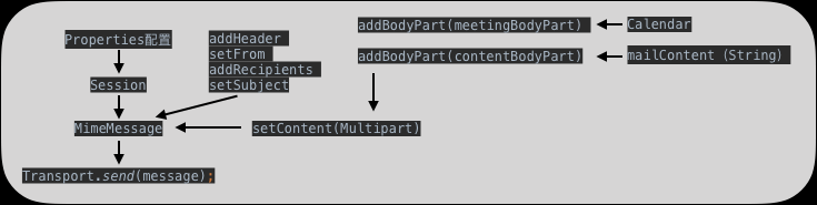 最关键是两点,一是实现RFC2445标准(日历数据交换),会议邮件的核心;二是理解JavaMail实现发送邮件的关联,下面关联图的左边部分就是了。没实现前觉得挺难,理解了就是拼装的事。