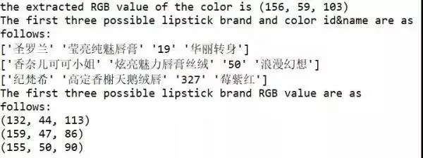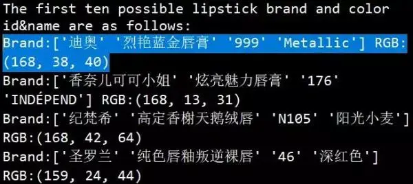 几经波折,最后输出的结果还是可以接受的,上图人像中涂的口红色号,感兴趣的读者可以查下正好是下面输出排名第一的口红信息。