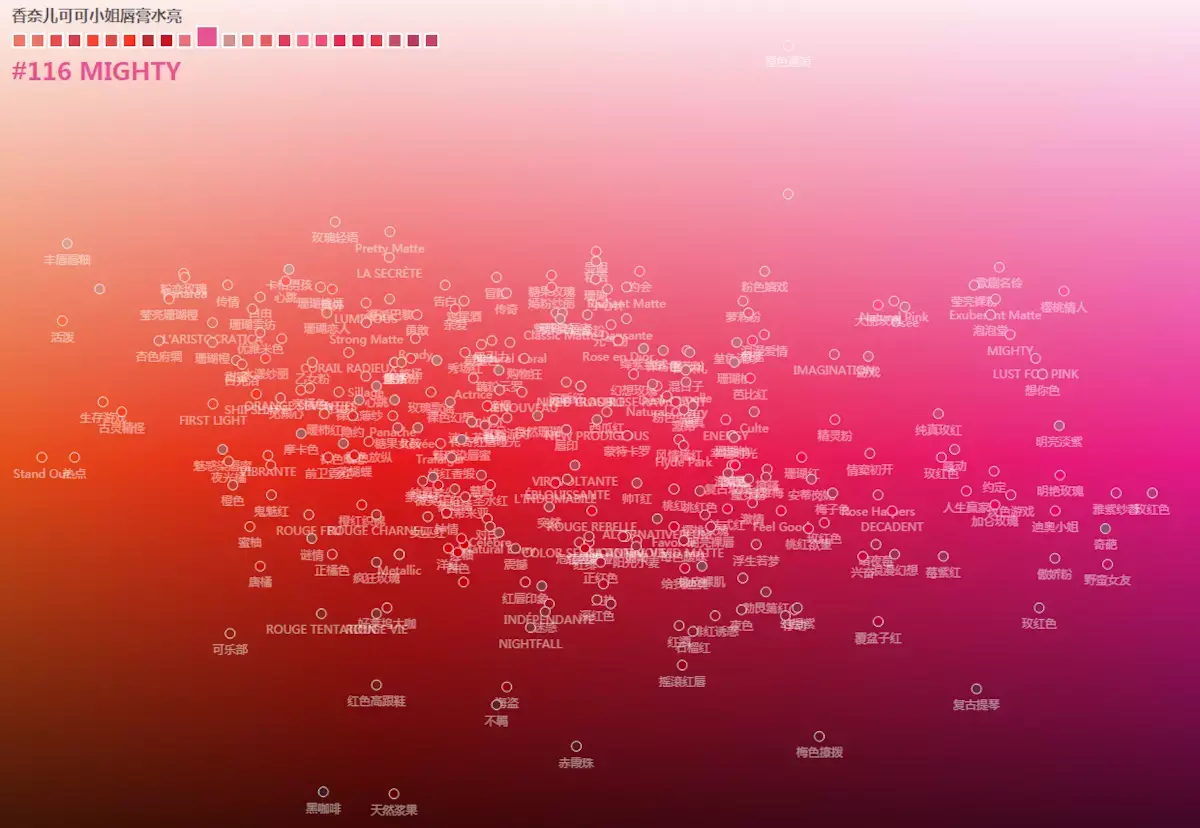 还好,在万能的 Github 上找到了一个宝藏数据库“口红颜色可视化”,这个数据库堪比口红的色号宇宙,不仅囊括了当前最主流品牌的各种系列色号,还很良心的在色盘上排列了出来。
