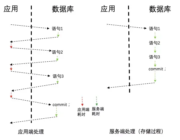 在 C/S(client-server)模型中,一条 SQL 语句从发起到执行完成需要经历从客户端输入、网络传输、SQL 优化、执行、结果返回到客户端这样一个流程。而具体每一条 SQL 的执行可能只是做一个字段的更新,所需要的执行时间是非常短暂的,从整个链路的角度来看,大量的时间会花费在与客户端的交互过程中,造成资源的浪费和耗时的增加。那么如何解决这个问题的呢?答案就是使用存储过程。