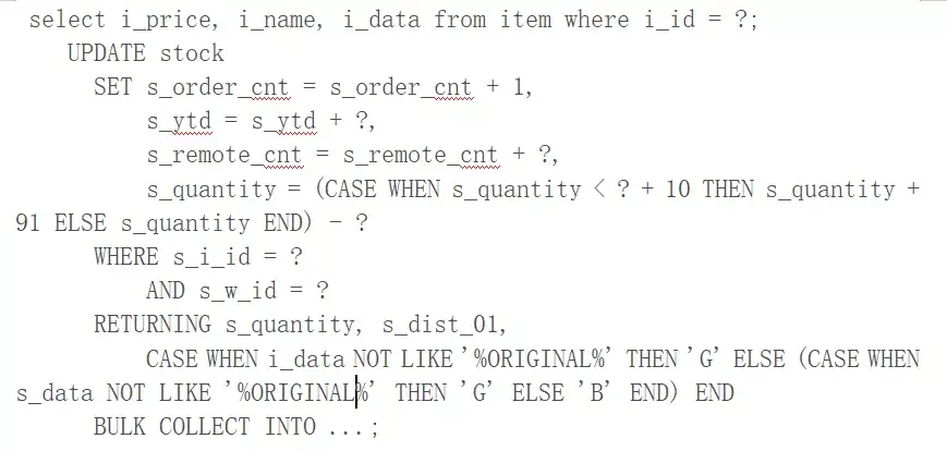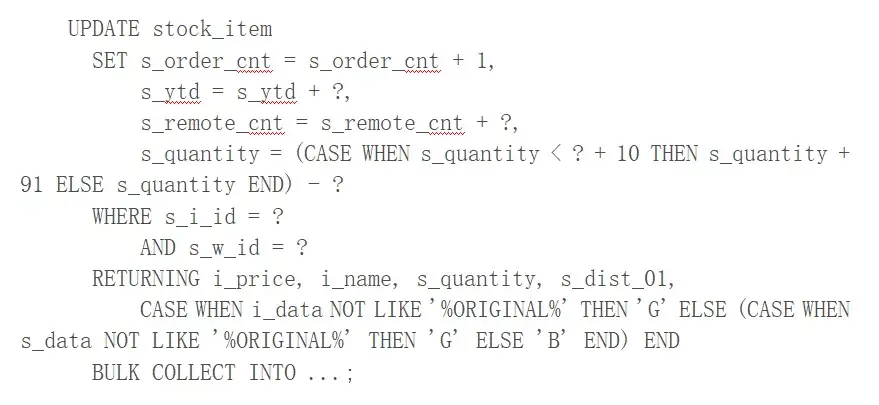 另外一个在 TPC-C 测试中发挥了重要作用的功能就是对 DML 语句进行批量处理的能力,在 Oracle 中该功能也称为“Array Binding”。一条 SQL 在数据库中的执行过程大致上可以分为“计划生成”和“执行”两个阶段。尽管我们对 SQL 的执行计划做了高速缓存,但找到一个合适的执行计划在整个执行过程中仍然是比较耗时的一个部分。那有没有办法省去这个时间呢?当一组 SQL 的执行计划完全一样而只有执行参数不同时,在存储过程中我们可以通过特定的语法将他们的执行做成一个批量处理的过程,此时“计划生成”只需要做一次即可,这就是所谓的“Array Binding”。