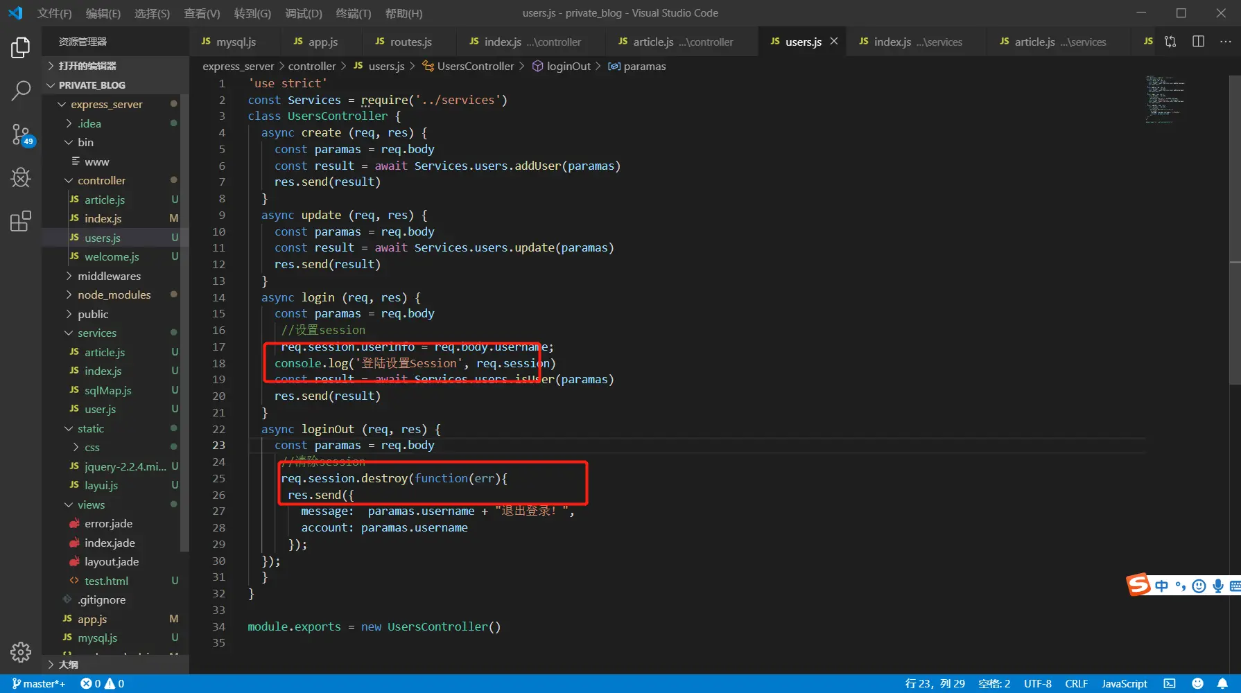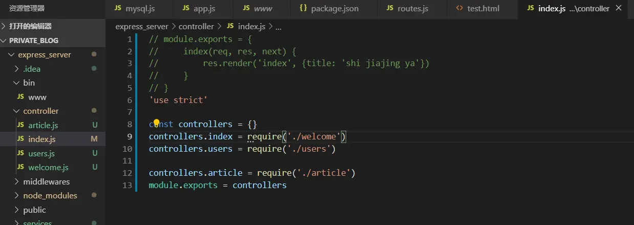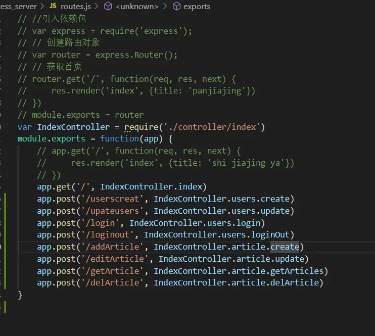 先,在根目录下创建controller/index.js,在index.js中编写如下代码,思路:把每个页面的业务逻辑单独写在一个js文件里,index.js文件引入他们,封装成对象暴露出去