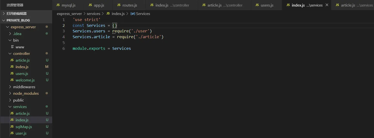 先,在根目录下创建server/index.js,在index.js中编写如下代码,思路:把每个页面的数据结构和对数据库操作单独写在一个js文件里,index.js文件引入他们,封装成对象暴露出去