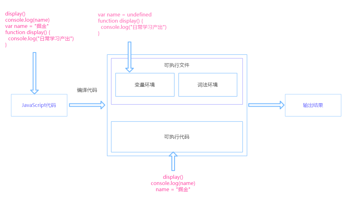 变量提升并非从物理层面移动到代码的最前面,实际上变量和函数声明在代码中的位置是不变的,JavaScript代码是在内存中执行的,所以时常都说JavaScript代码先编译,后执行;这个过程会出现两个模块:执行上下文和可执行代码这两个定义经常都会在各种博客和项目中提及到,后续诸如 this、变量、对象都与之相关
