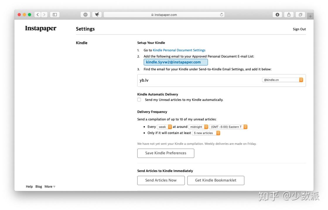 在 Instapaper 的个人设置 里,我们可以直接配置接收 Kindle 接收邮箱和推送时间。然后 Instapaper 会生成电子杂志。