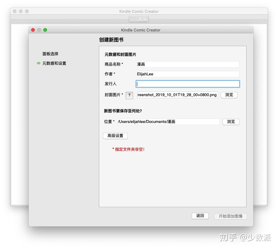 接下来,我们用 KCC 将图片制作成电子书。KCC 没有复杂的功能,非常容易上手。打开应用点击「创建图书」,并进行简单的书籍设置和元数据添加,就可以开始添加图片。KCC 支持 jpg、pdf、tiff、png和 ppm 格式的文件。