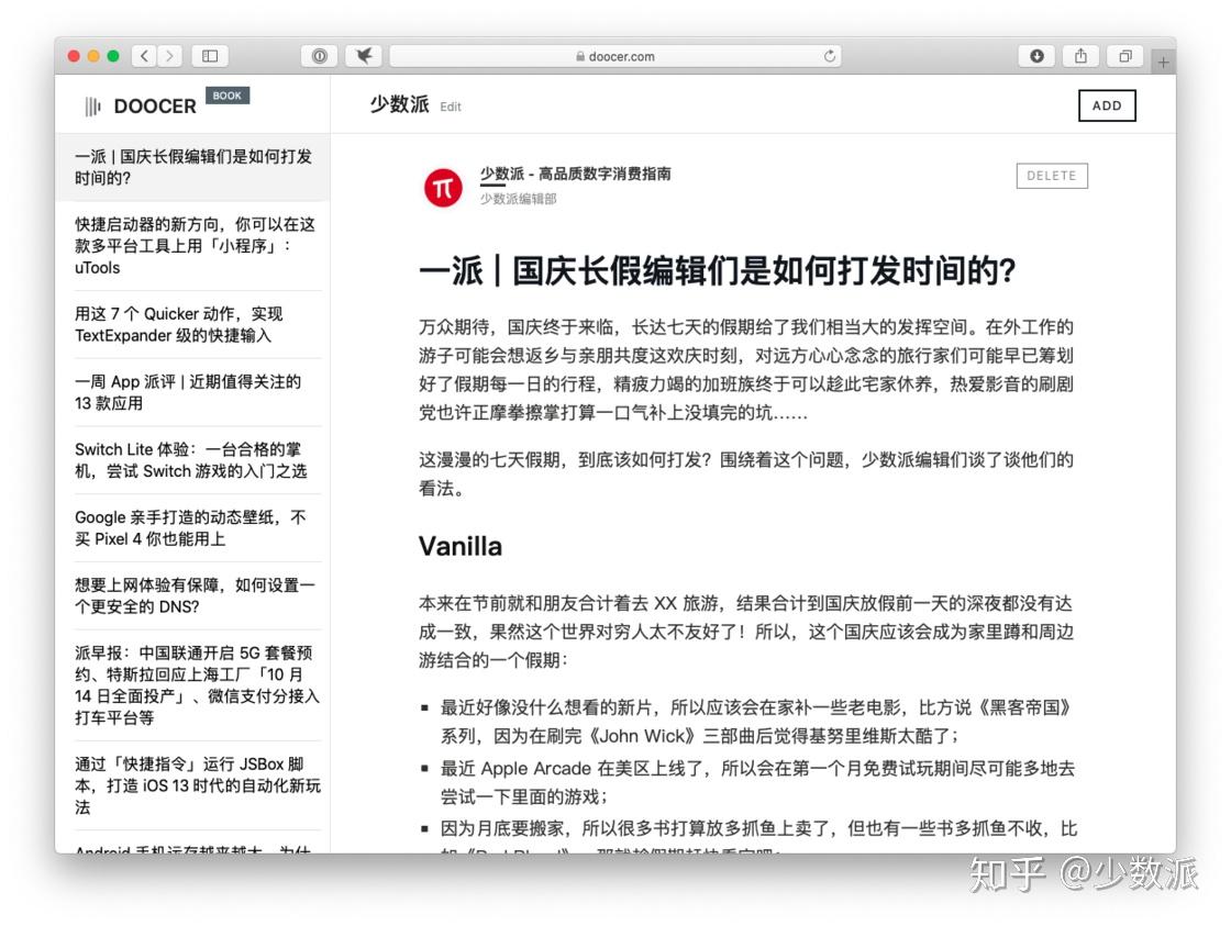 利用 Doocer 推送文章的方法必须手动进行,因此相较于 WhereMyLife 它要逊色许多。不过 Doocer 本质就是 RSS 阅读器,支持在线阅读,还可以生成 epub 和 mobi 两个格式。