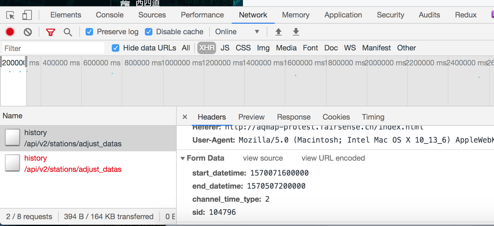 二、 1.打开测试文档,首次打开都需要登录账户的,Aqmap的页面首页也会自动跳转到登录页面; 2.看下面这个图片的Preview里面是否返回了数据就知道有没有数据了,或者其他的也是调用这个接口的地方是否由数据