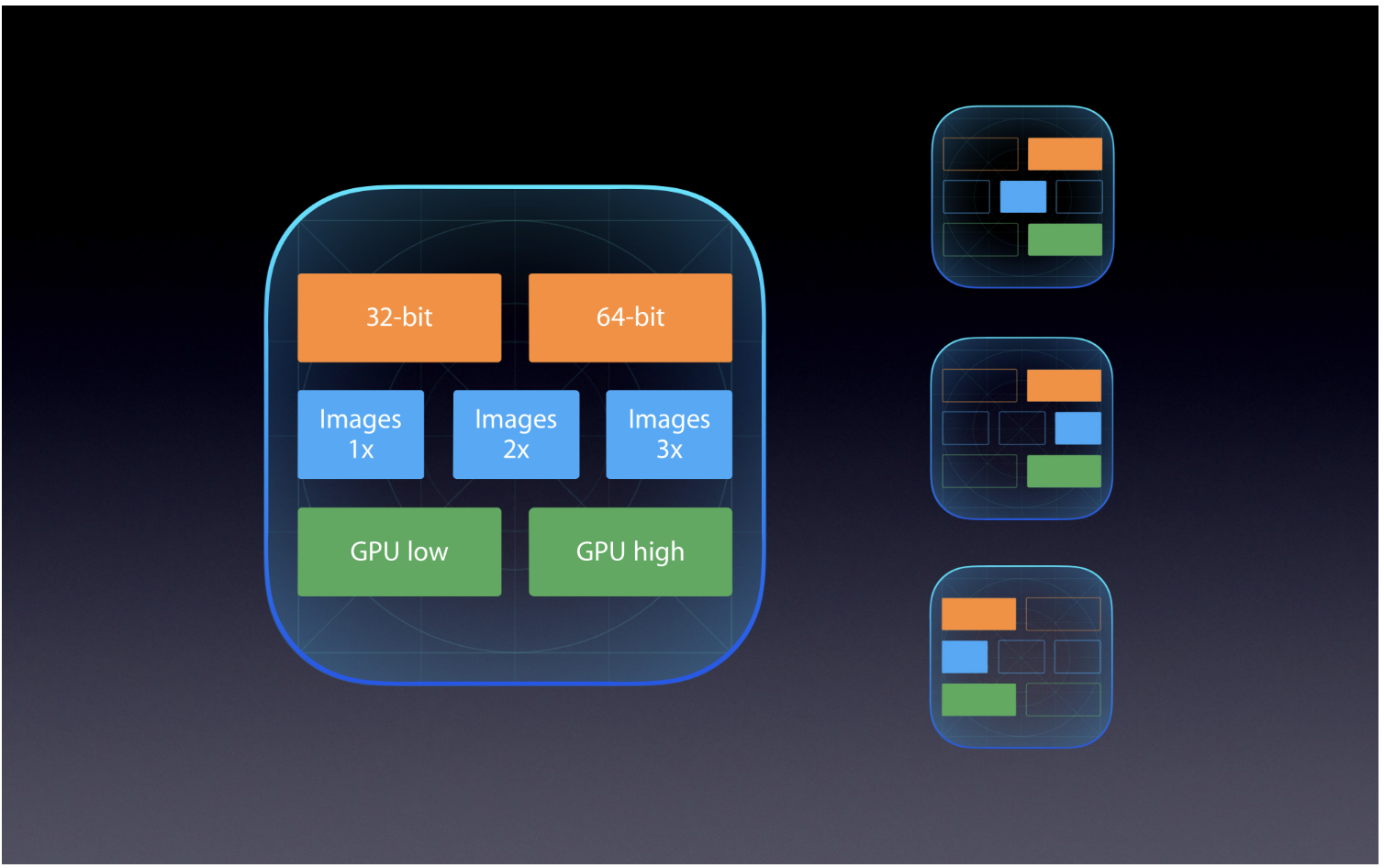 向iTunes Connect上传App后,会对App进行切割,创建不同的变体,一个变体只包含针对某个目标设备的可执行架构与资源等,这样就可以适应到不同的设备。