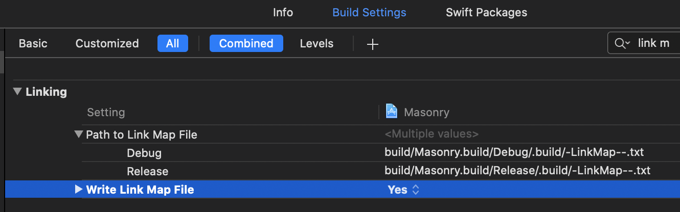 可以通过分析LinkMap来获得所有的类和方法的信息。获取LinkMap可以通过将Build Setting里的 Write Link Map File设置为Yes,然后指定Path to Link Map File的路径,就可以得到每次编译后的 LinkMap 文件了,设置选项如下所示: