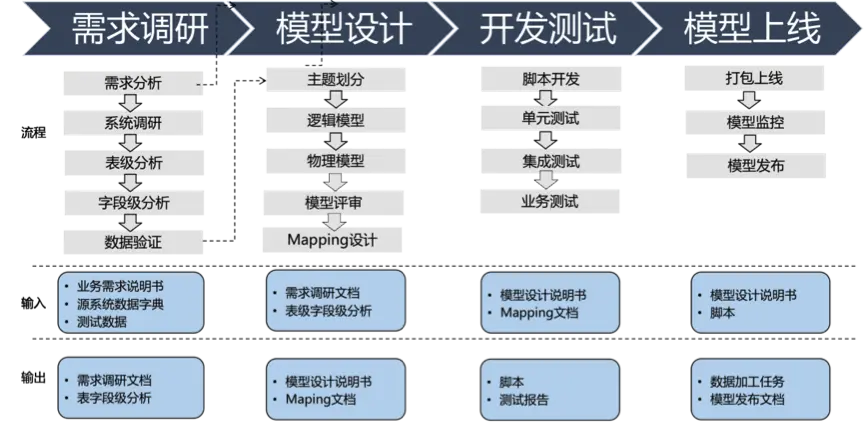 马蜂窝数仓模型设计的整体流程涉及需求调研、模型设计、开发测试、模型上线四个主要环节,且规范设计了每个阶段的输出与输入文档。