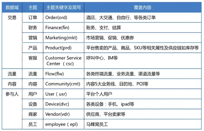 基于对目前各个部门和业务系统的梳理,马蜂窝数据仓库共设计了 4 个大数据域(交易、流量、内容、参与人),细分为 11 个主题: