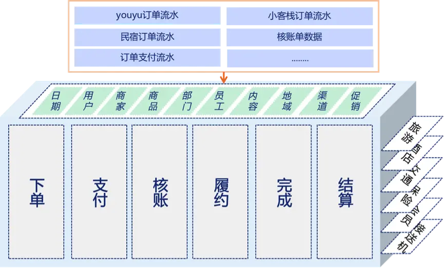 垂直整合:一次完整的业务流转通常要经历多个环节,各节点信息产生的时点不同、储存的数据表不同。垂直整合就是将同一业务中各关键节点信息整合至业务全流程宽表模型中。马蜂窝订单交易模型的构建就采用了这种方式,下文将进行详细介绍。