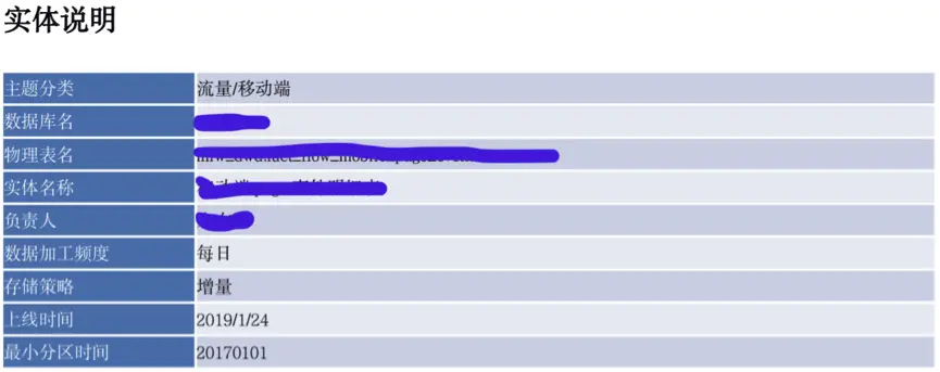 通过对技术、业务元数据进行清晰、详尽地描述,形成数据知识,给数据人员提供更好的使用向导。我们的数据知识主要包括实体说明与属性说明,具体如下: