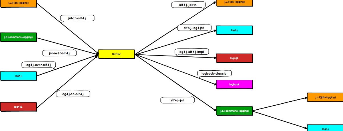 图上列举出了多种日志实现框架转换成Slf4j接口和Slf4j接口绑定多种日志实现框架所涉及到的相关Jar包。通过这些桥接包,我们可以轻松实现项目中日志框架的统一。对于哪些包需要引入/哪些包需要排除也就一目了然了。